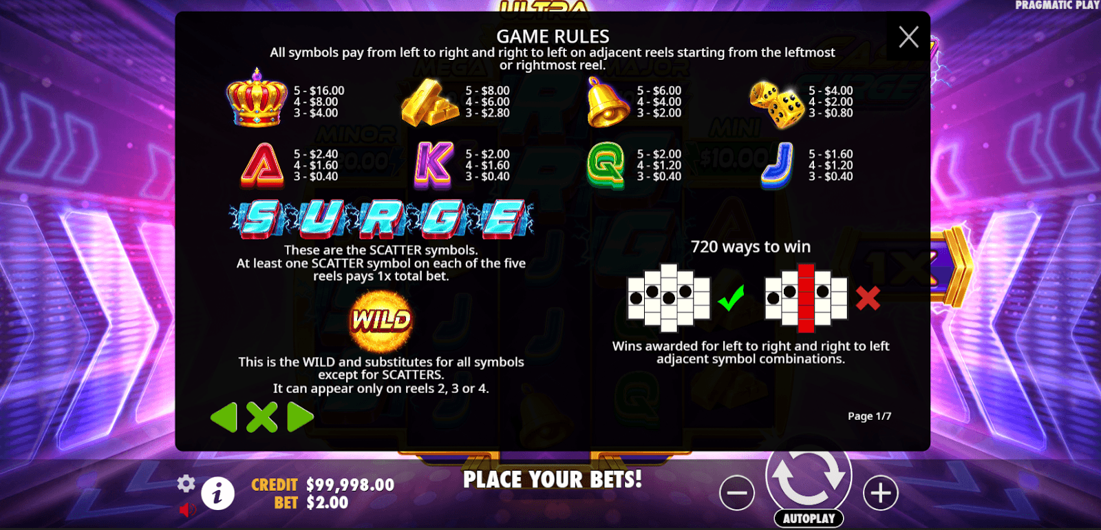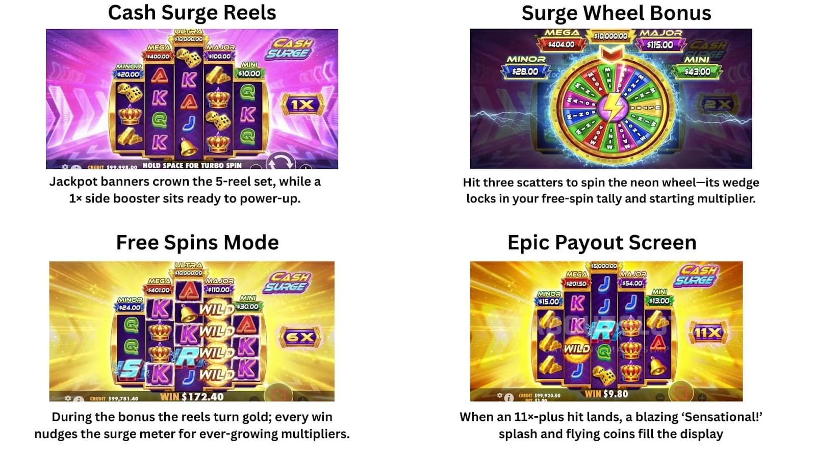 - SURGE Free Spins – collect letters S-U-R-G-E to unlock four spins with all current progressives locked in; extra letters add +1 spin and lightning keeps upgrading prizes.