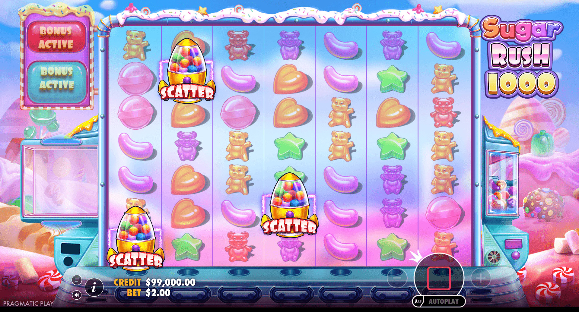 Visually, it’s classic Sugar Rush: pastel skies, glossy sweets, gummy bears, and a bright gumball-machine vibe. It’s loud and cheerful, but importantly, the grid stays readable — which matters because this slot rewards paying attention to where wins land, not just that they happen.